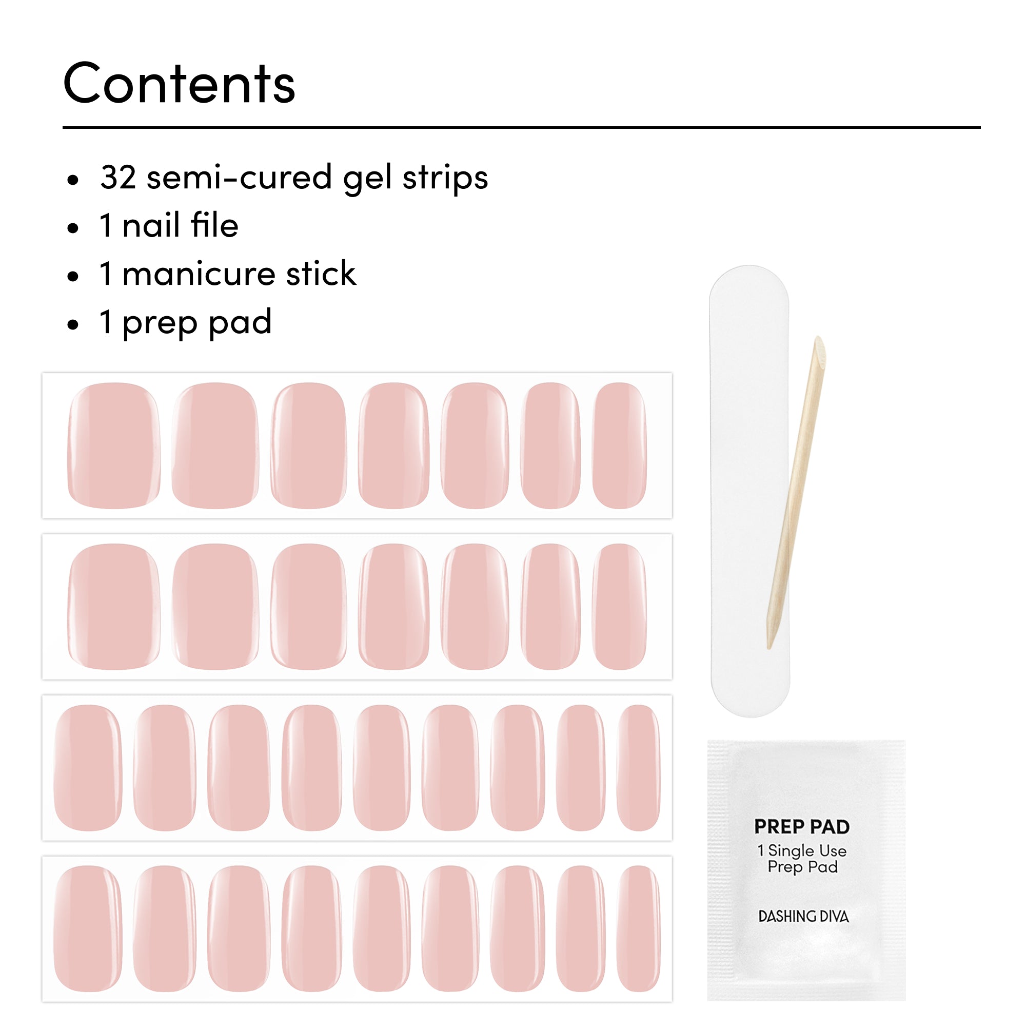 32 semi-cured gel nail strips, 2 prep pads, 1 nail file, 1 manicure stick
