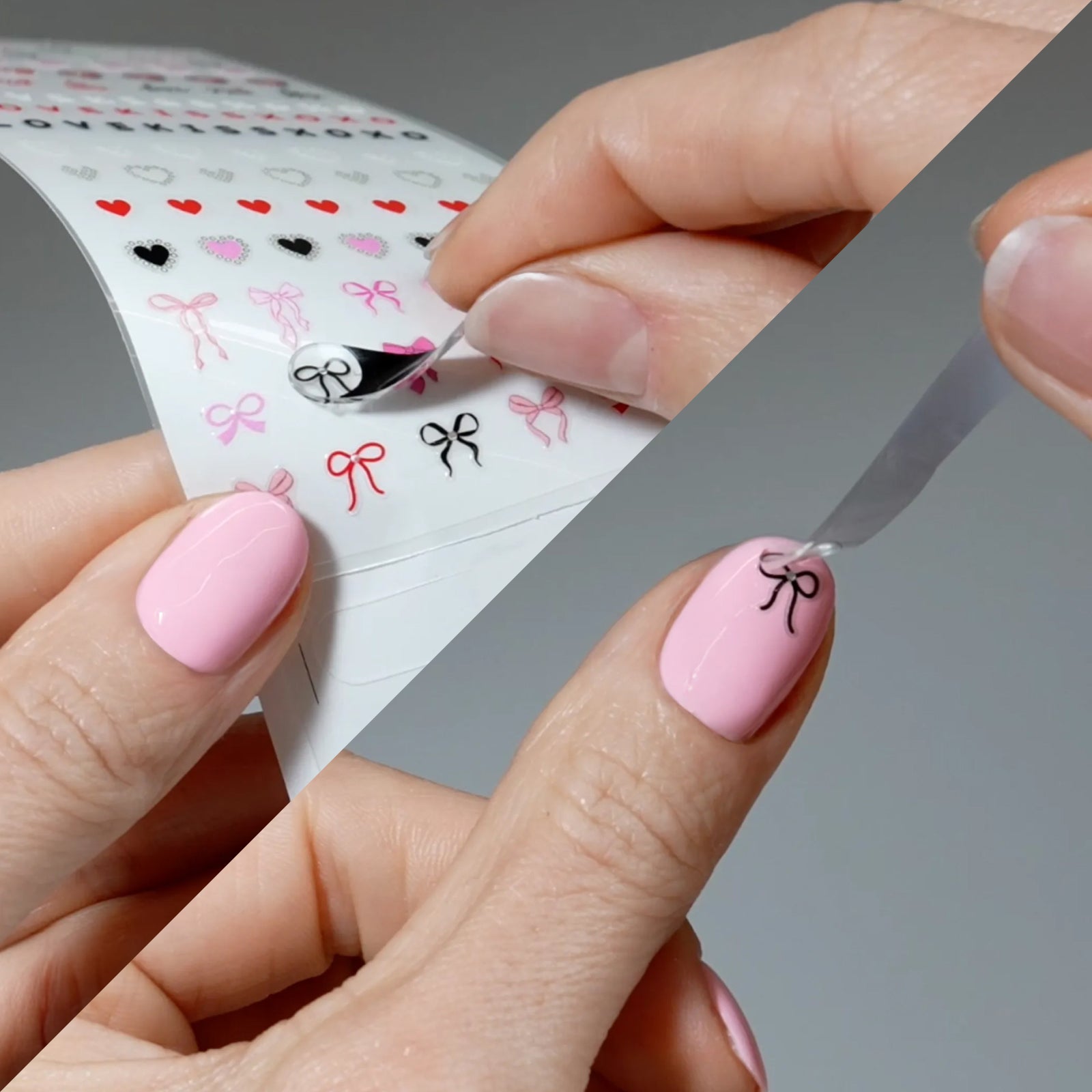 Candy-pink glossy nails with hearts and bows you can place wherever your heart fancies.
