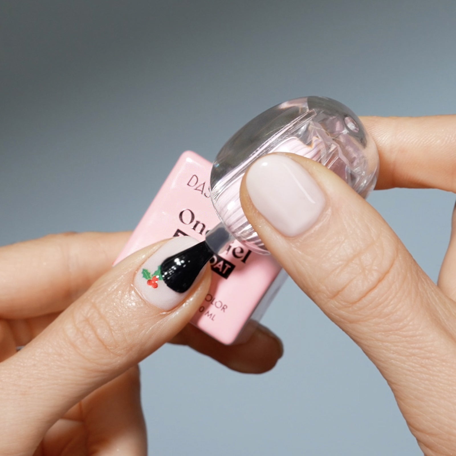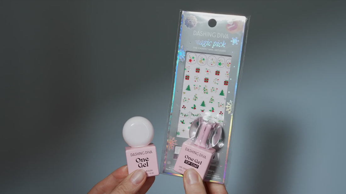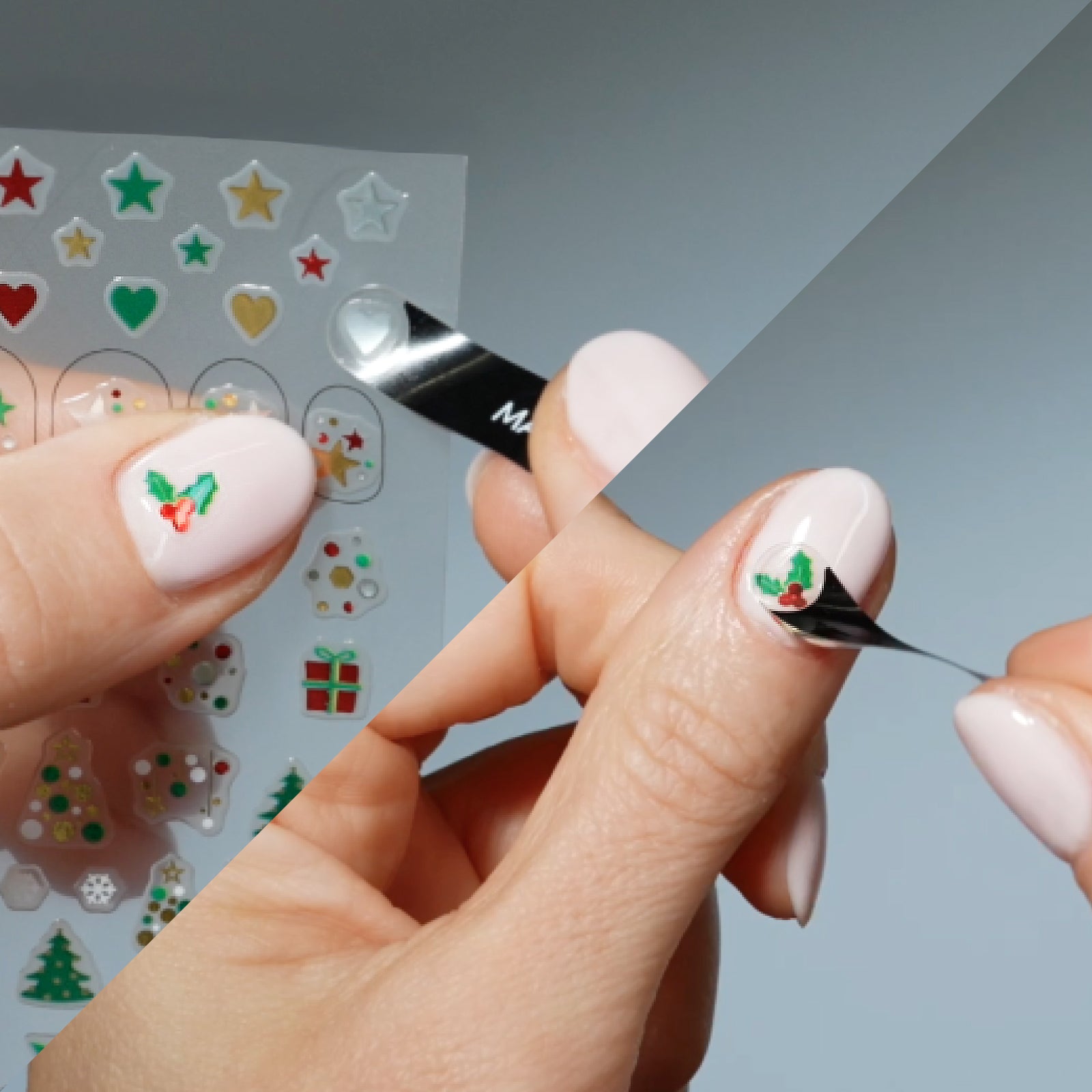A soft pink mani topped with festive holiday stickers—snowflakes, presents, and tiny touches of holiday joy. It’s easy, fun, and you’re in charge of the merry little details.