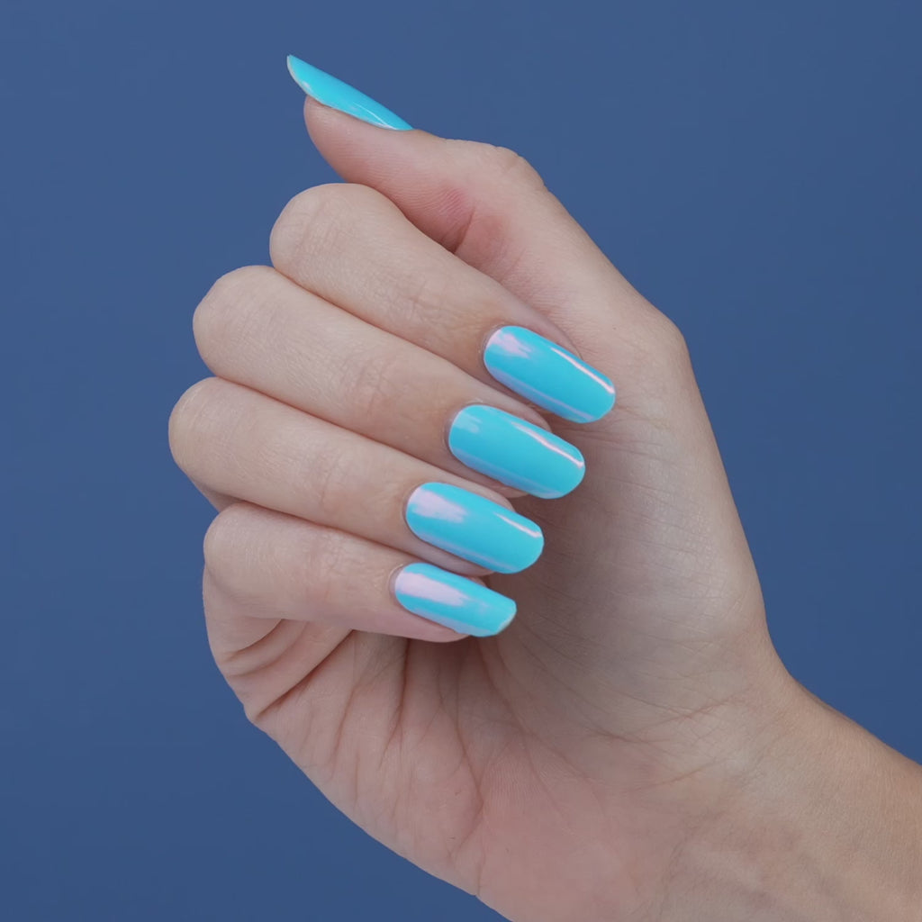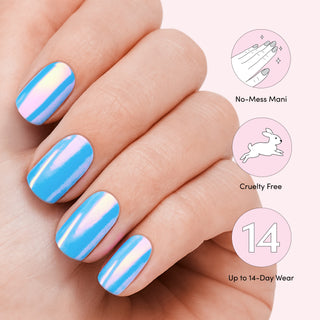 Semi-cured blue gel nail strips featuring a pink chrome shimmer with mega volume and maximum shine.