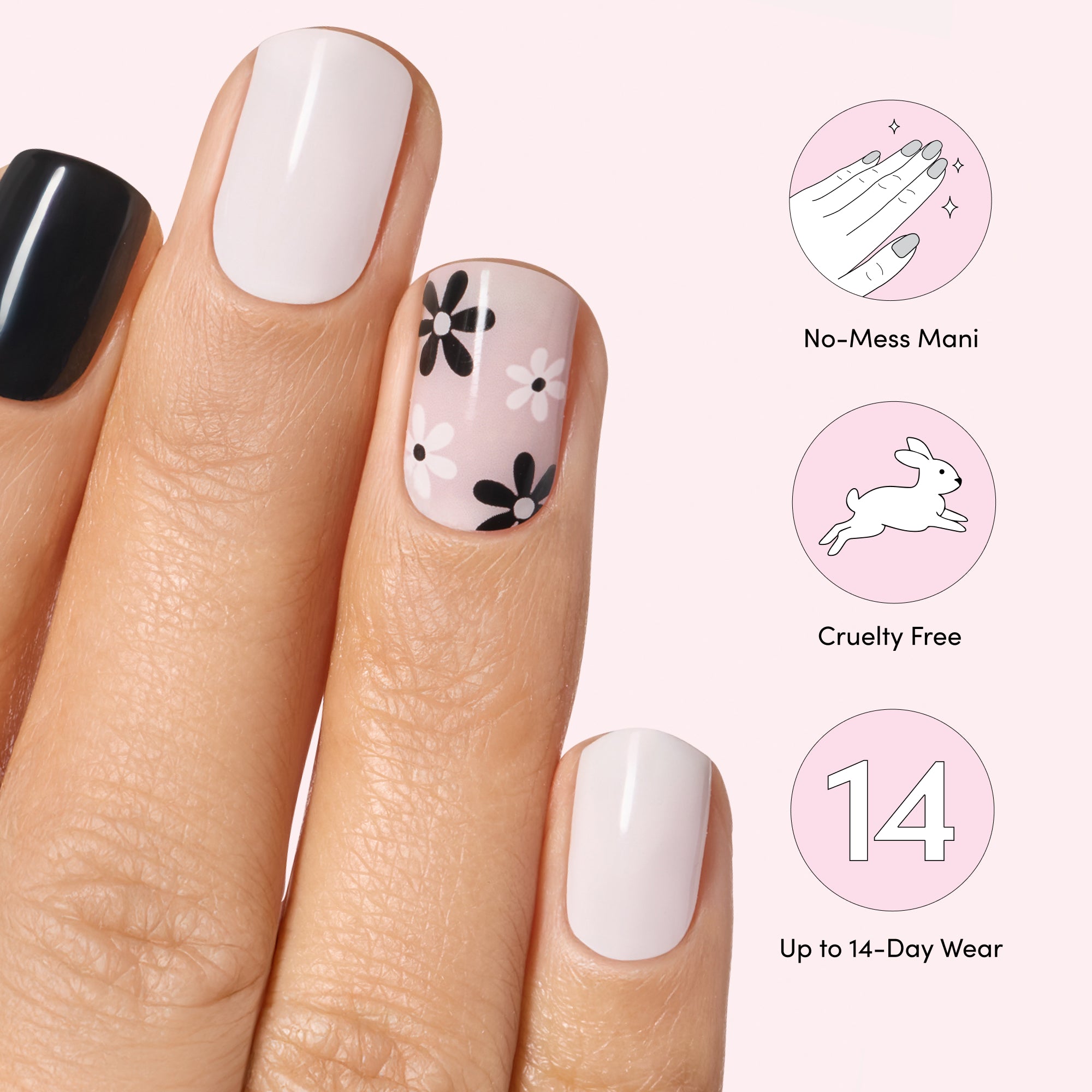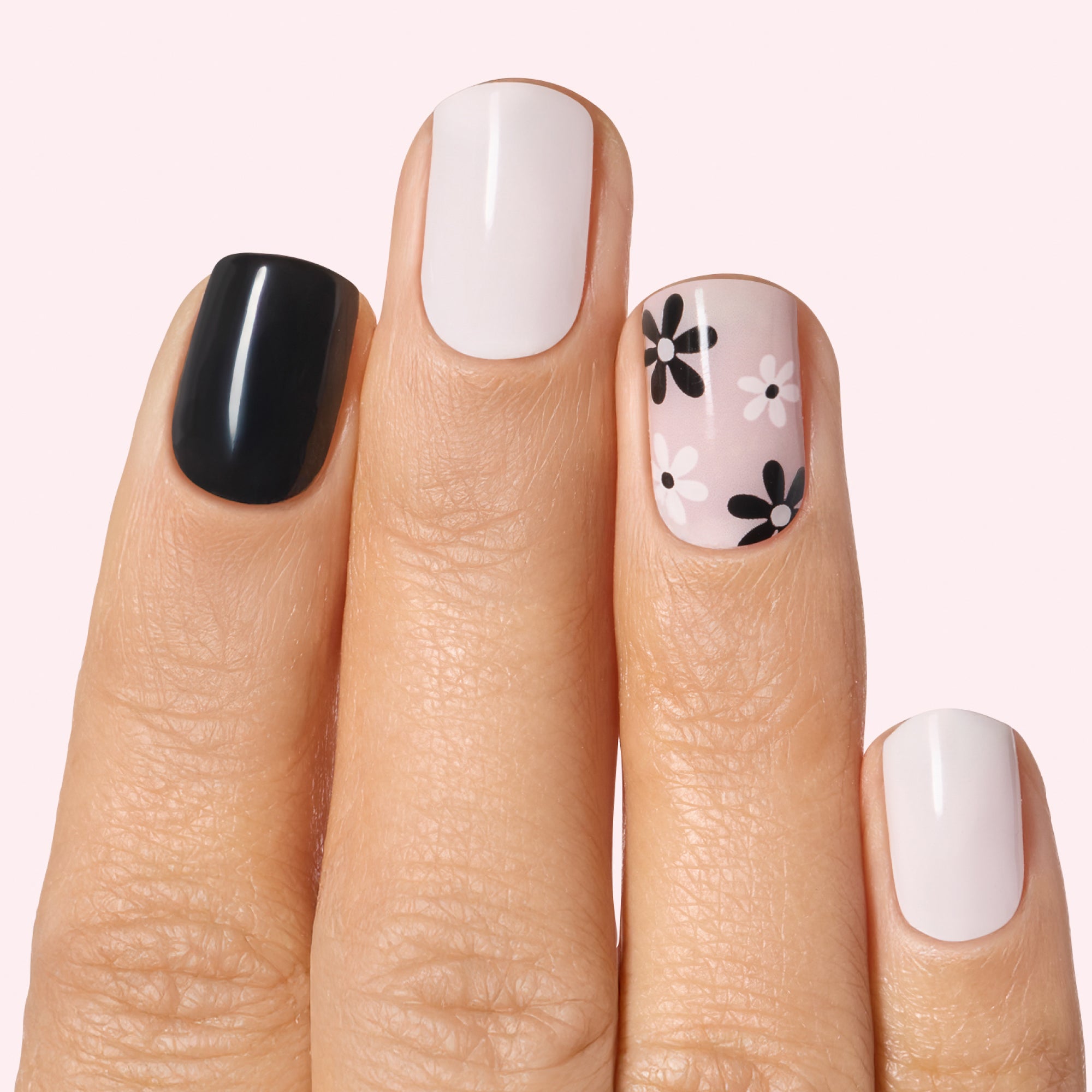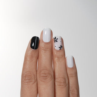 Semi-cured black, white, and nude pink gel nail strips featuring black & white flowers with mega volume and maximum shine.