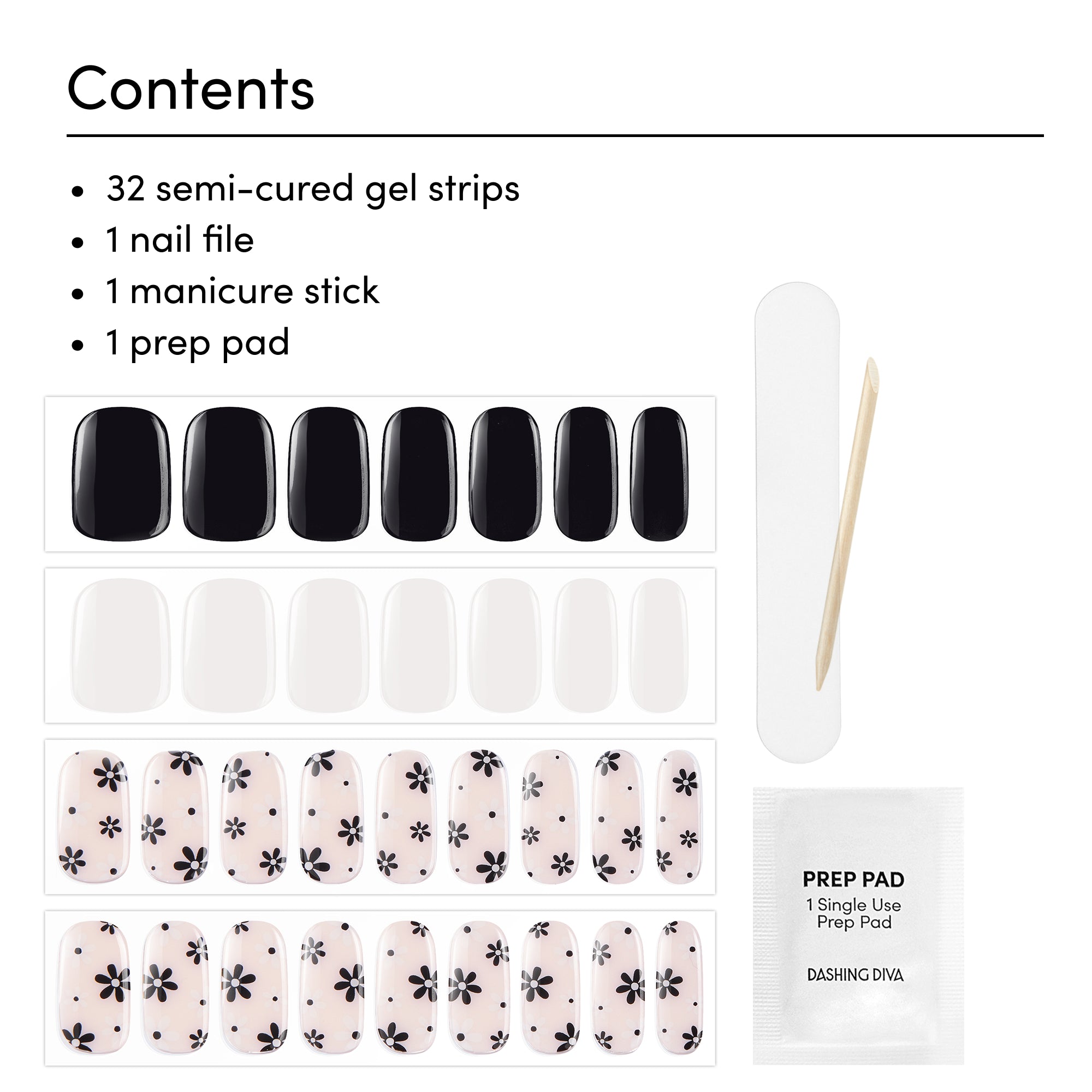 32 semi-cured gel nail strips, 1 prep pad, 1 nail file, 1 manicure stick