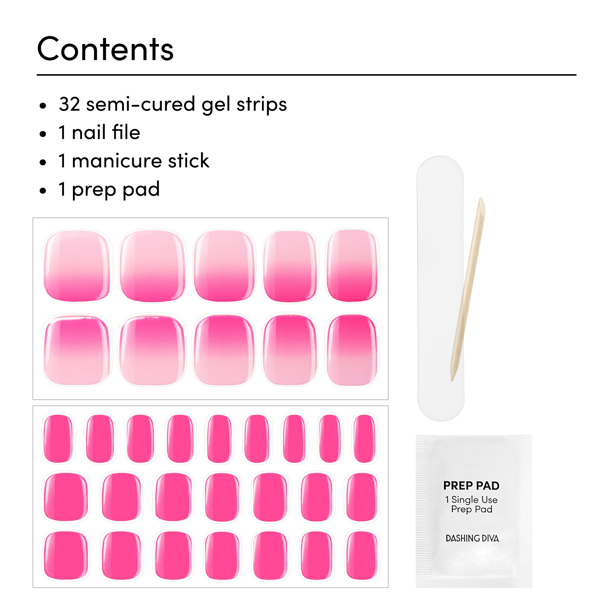 32 semi-cured gel nail strips, 1 prep pad, 1 nail file, 1 manicure stick