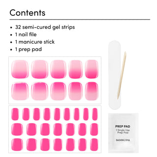 Semi-cured gradient hot pink to light pink gel nail strips with mega volume and maximum shine.