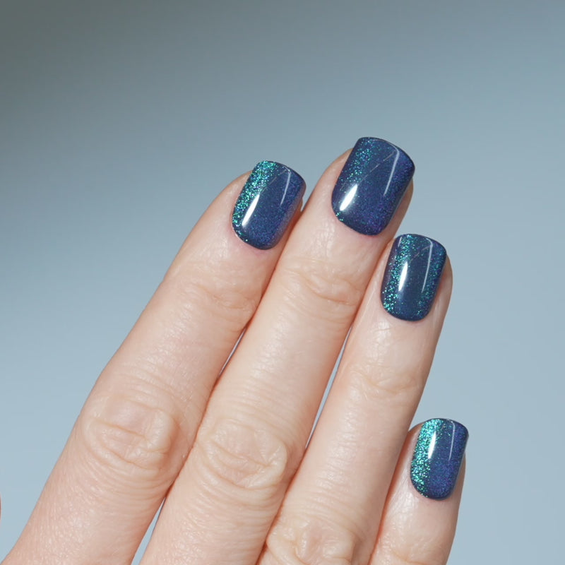 Iridescent blue-green press-on gel nails featuring shimmery velvet effects.