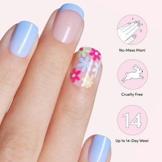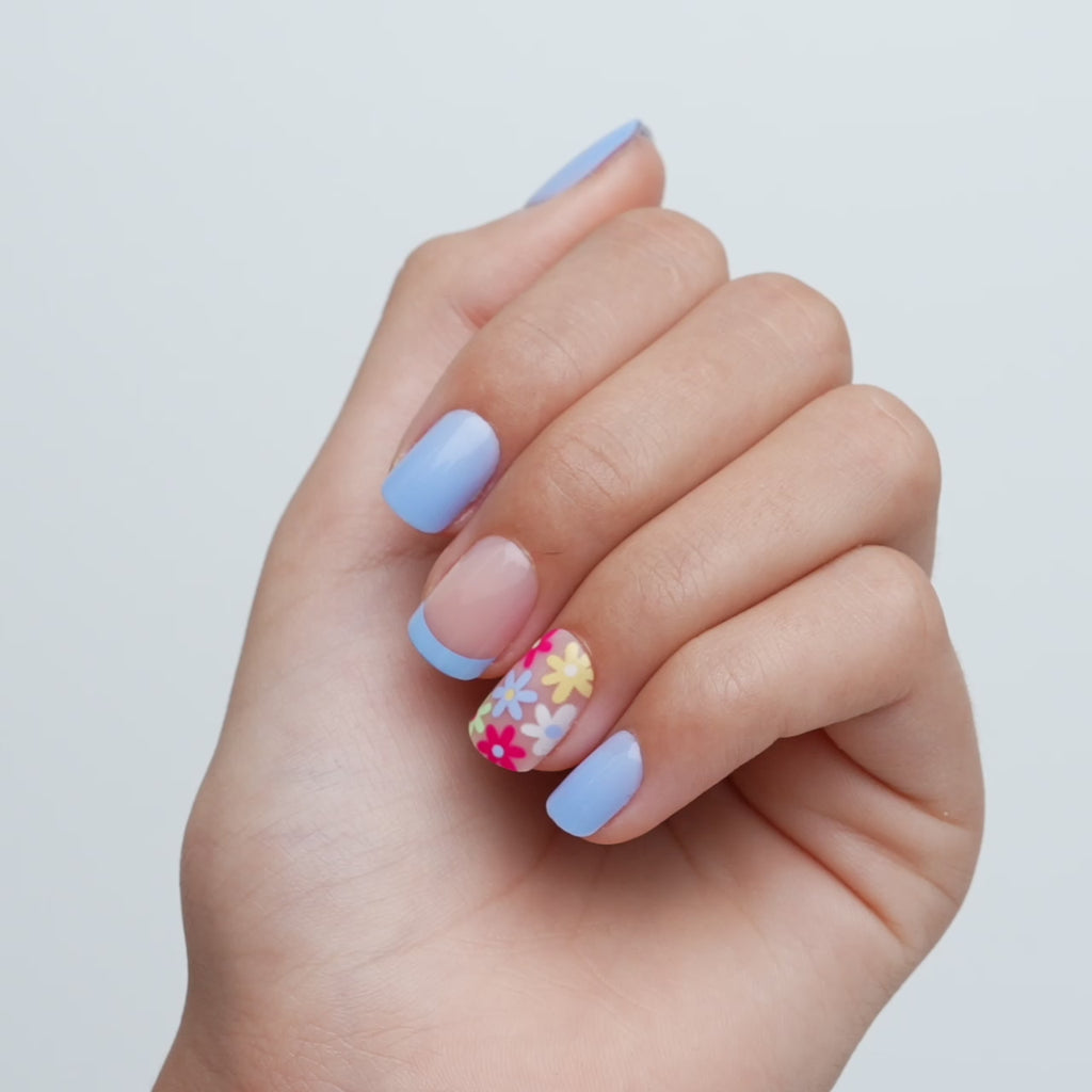 Medium length, square shape, glossy finish. Light nude and baby blue press-on gel nails featuring french tips and floral accents.