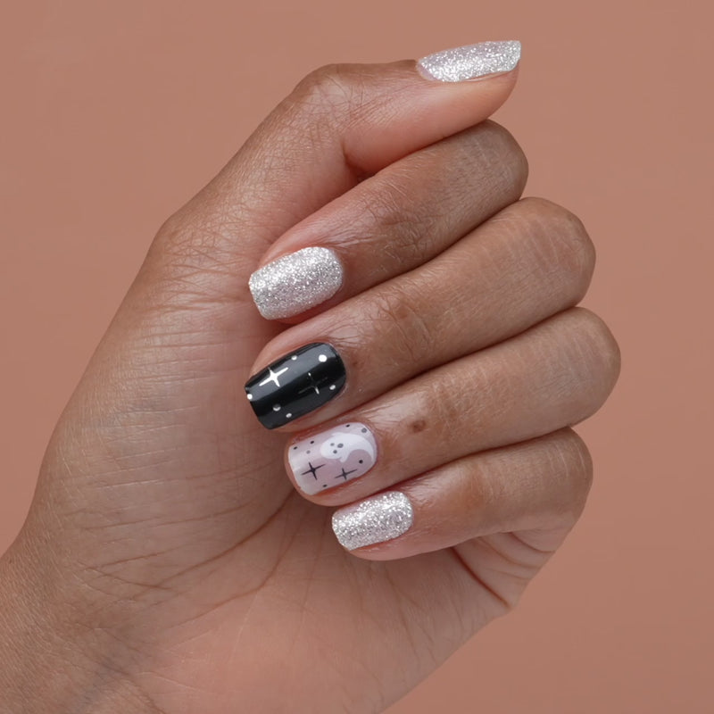 Looks like you just saw a ghost… Black and light gray gel nail strips featuring ghosts and metallic silver accents with a glossy, high-shine finish.