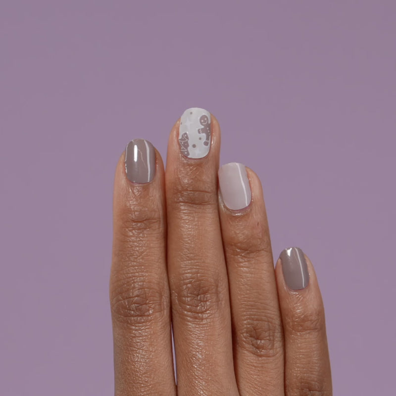 Mushroom & stone gel nail strips featuring gingerbread accents with glossy & matte finishes.