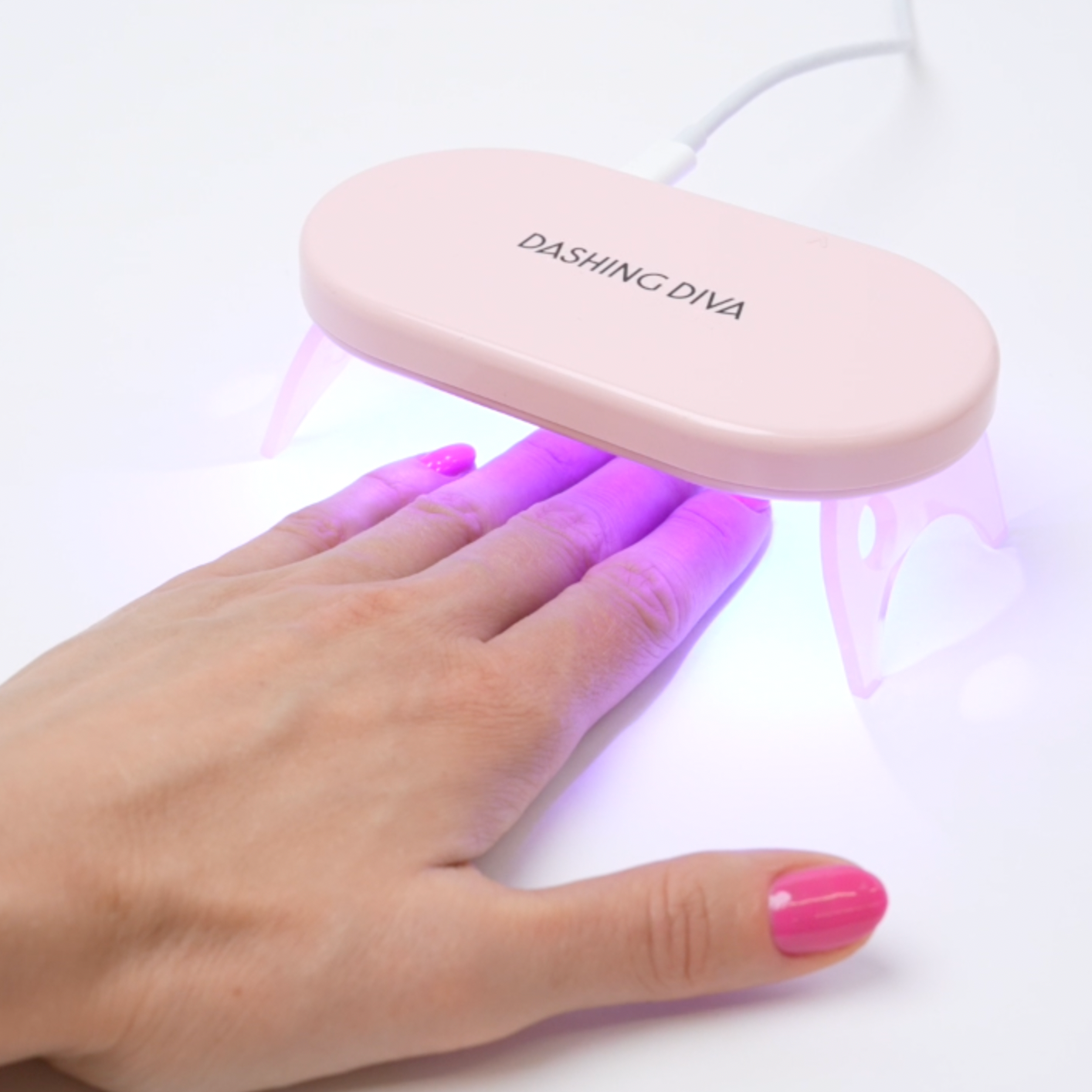 Shake bottle well before use. Pick up a small amount of polish on the brush and apply one ultra-thin coat of gel polish to nails. Press button on the back of lamp to activate LED light. Cure nails* for 60 seconds. Apply a second coat of gel polish to nails, then cure. For desired opacity, apply a third coat. *Make sure not to surpass the red laser guide. Lamp will automatically turn off after 60 seconds. NOTE: The lamp fits four fingers at a time. Cure thumb separately.