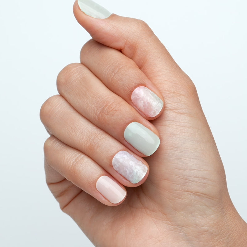 Semi-cured soft green & beige gel nail strips featuring iridescent marble accents with mega volume and maximum shine.