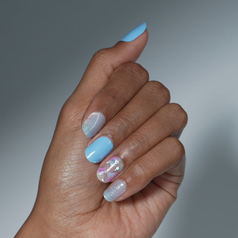 Dive in. These semi-cured gel nail strips with builder gel strength deliver mega volume in ocean blue and aquatic shimmers with a high-shine finish that makes waves.