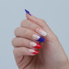 Semi-sheer nude pink gel nail strips featuring red, white, and blue french tips & metallic stars with a glossy, high-shine finish.