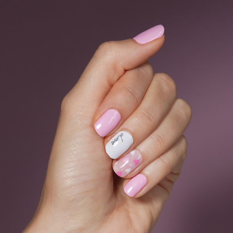 Feeling: all the feels, but mostly just love. A mix of light pink, heart-speckled, and l-o-v-e-scribbled gel nail strips with a glossy, high-shine finish.