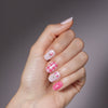 Pale pink gel nail strips designed with cherries, strawberries, and bubblegum pink criss-cross motifs, all finished with a glossy, high-shine finish.