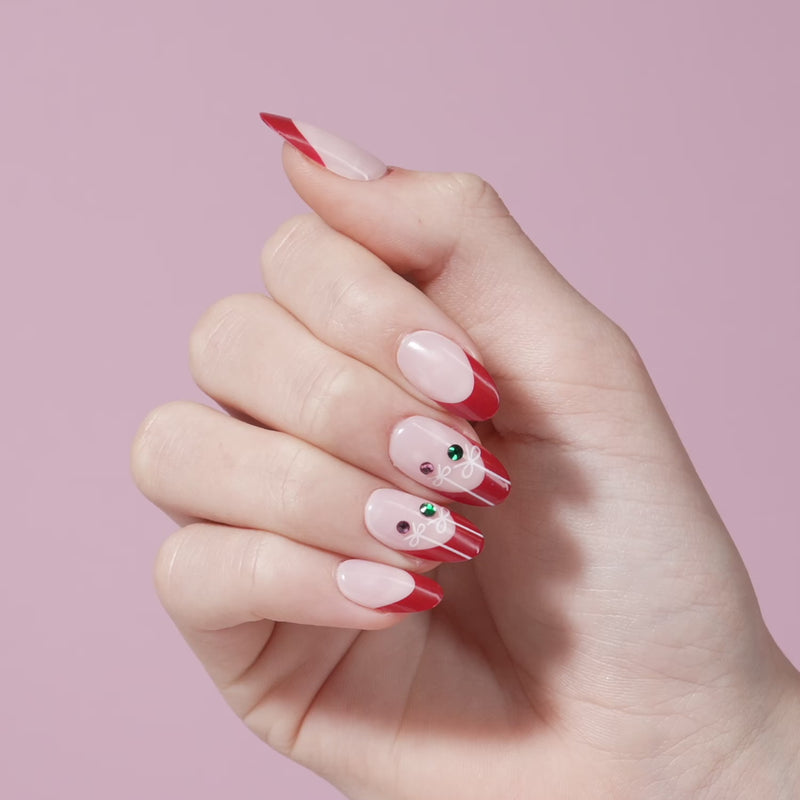 Medium length, almond shape, glossy finish. Nude pink press-on gel nails featuring ornaments, rhinestones, and red french tips.