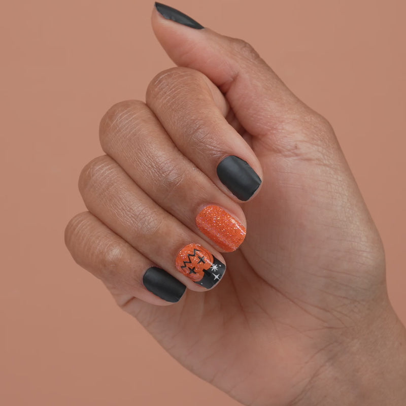 Heeey. š Matte black and glossy glittered orange gel nail strips featuring glittered pumpkins.