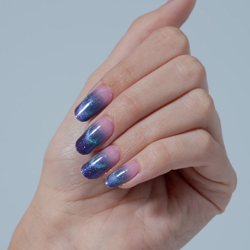 Let's get to experimenting. Semi-cured baby pink gel nail strips featuring ombré iridescent teal/purple tips and velvet shimmer with mega volume and maximum shine.