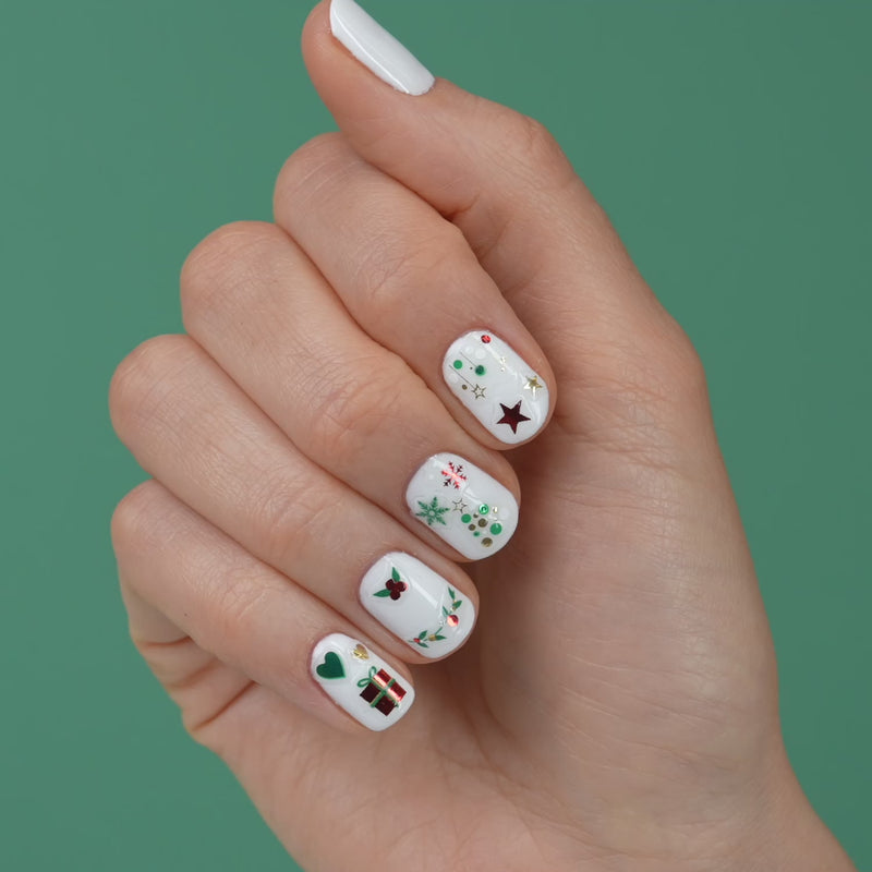 Premium nail art stickers featuring metallic gifts, trees, stars, hearts, holly, snowflakes, and more!
