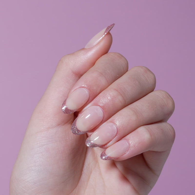 Medium length, almond shape, glossy finish. Semi-sheer peachy nude press-on gel nails featuring glittered pink french tips.