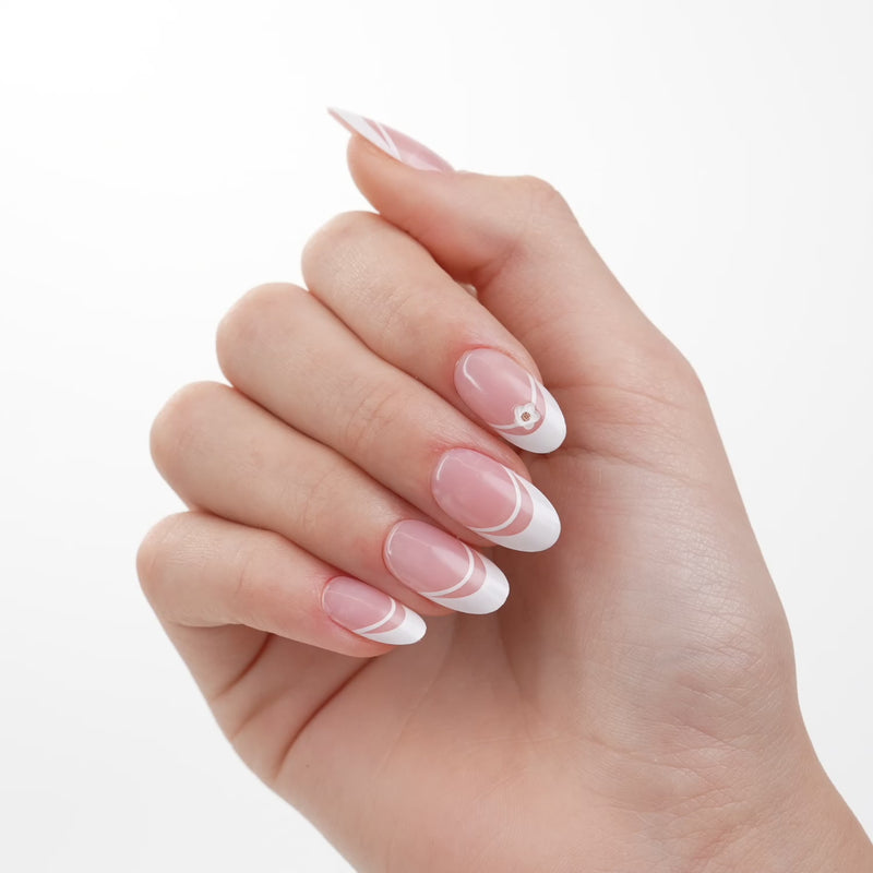 It's French... with the most romantic—and ever-so-slightly risque flourish in these medium-almond-shaped press-on gel nails.