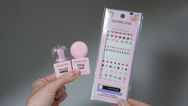 This bundle includes a 1-step bubble gum pink gel nail polish that gets mega volume and shine from One Gel Top Coat and a One Gel LED Lamp cure. Flirty heart and bows nail art stickers apply easily on top to arrange however your heart desires.