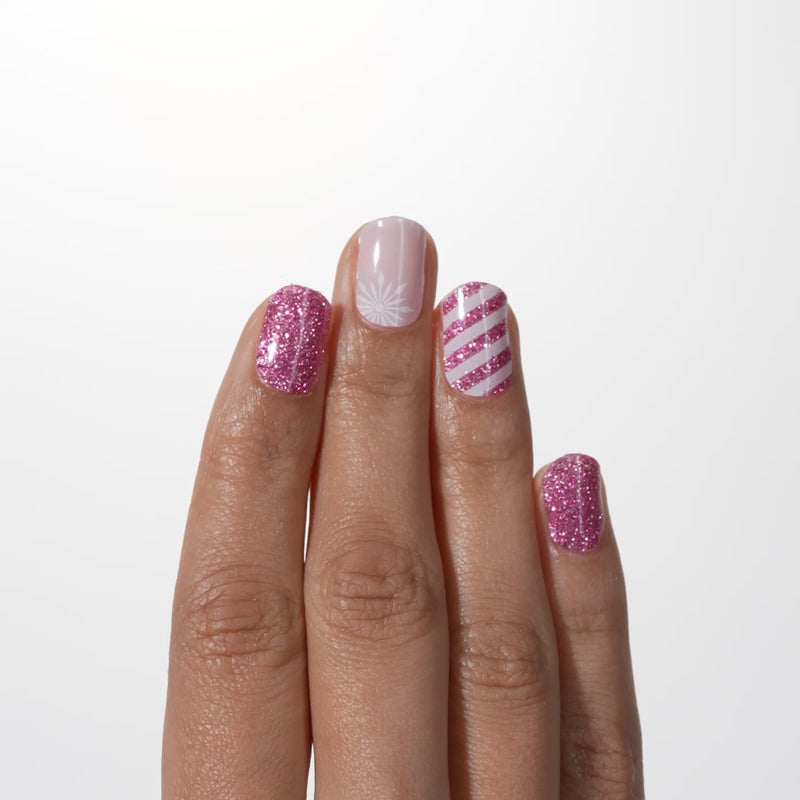 Sparkling or still? Semi-cured nude pink & glittered rose gold gel nail strips featuring stripes & snowflakes with mega volume and maximum shine.
