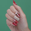 Santa's gift to you for being so good this year. Red & white gel nail strips featuring santa, reindeer, metallic stripes, and silver glitter with a glossy, high-shine finish.